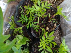 マリゴールドアイシスを鉢上げします。(完了!未だ幼い感じなので、4本ずつポリポットに鉢上げしました。)今日丸一日は不織布の下です。植える場所に近い処で育ててから、定植します。