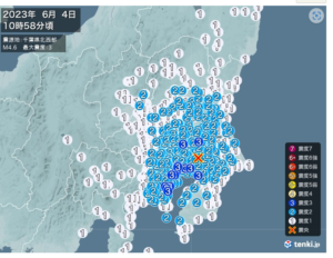 10時59分(発生は10時58分)揺れが来ました。大きくはないけれど、少し長かったかな。茨城県南部、千葉県北西部、神奈川県東部が震度3でした。11時4分に東京23区も入りましたね。千葉県北西部がM4.6で震源でした。70㎞と言うやや深発地震でした。この町は名前も出ていないけれど、震度1ですね。35.8N,140.1Eですから、この町よりほぼ真北60㎞位かな。