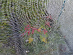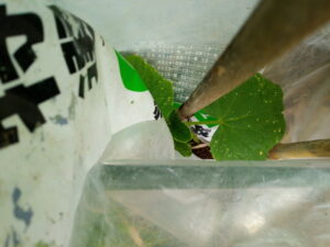昨日は全然ついていなかったウリハ虫が今日は一畝の南瓜に着きました。行灯内部は大丈夫ですが、出ている葉はやられました。未だ壊滅的ではないので、挽回して貰いたいとトラップを作り、1時間に1度見回りをしています。ウリハ君たちも人影が近寄る時は危険だ、と学習したようです。一氣に飛び立ちます。そこで私も段々慣れて来て、近寄る時に葉の下側から手を近づけ軽く葉を丸める感じで漏斗状にしてボトルを葉の先に宛がいました。こうすると一挙に6匹、7匹と捕まえられます。入れたら水を回して攪拌することも大事です。しぶとい虫も居てボトルを這い上って来ますが、外側から指で弾くと下へ落ちます。