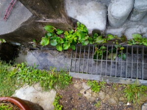 右: 下水の底に余ったモルタルを一週間位前に流しました。モルタルがある程度底上げするまでは我が家のお風呂は2-3日に一度半分だけにしました。やはりお風呂の残り湯を流すのが一番溜まってしまい、毎日流すと一定の水量が一番低い処に溜まりやぶ蚊の産卵池になってしまいます。暫くは半分くらいの湯舟にして行水です。其の残り湯は洗濯で綺麗に使います。