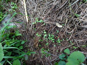 脇の通路の里芋です。全体的に葉の数が多いです。無施肥で萱マルチがほとんど。