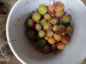 右: フェンスの向こう側にも5-6個落ちていたので、Kさんと木に生っている梅を回してとれるものは取ったっけ、と取ったのがこちら。鉢が大きいので少なく見えるけれど、合計で2㎏位ですかね。木には後60個程度なっていますが、安全圏の落ち梅となるでしょう。