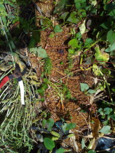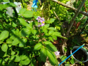 これから収穫するものは一畝東側の先頭にあるのが一つ、玉葱と共存していた処にいくつかありますね。一旦、全部掘り上げてグランドペチカの種イモになりそうなものが確定してからでも良いかな。あまり品種がごちゃごちゃすると分からなくなりますよね。