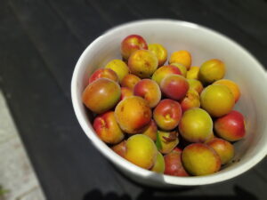 右: フェンスの向こう側にも5-6個落ちていたので、Kさんと木に生っている梅を回してとれるものは取ったっけ、と取ったのがこちら。鉢が大きいので少なく見えるけれど、合計で2㎏位ですかね。木には後60個程度なっていますが、安全圏の落ち梅となるでしょう。