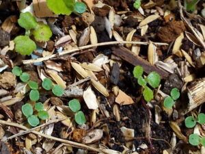 右: 禅寺丸さんの根本に置いた莢から出た味ゆたかの発芽です。