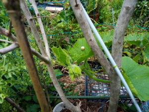 右: 行灯から出て来た南瓜を見つけたウリハムシが襲来しました。1時間に一度の見回りが欠かせません。椿の間引きした大枝が氣に入った南瓜は一時間も立たない内に巻き髭を絡めていました。