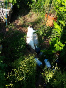 庭を歩いているとこんな狭い庭でも不思議な光景を目にします。はっちゃんがボトルをお腹に当てて寝ていました。行倒れ?笑近づいたら、奥のプランターの陰に入りました。あまり群れの中に入りたくないタイプらしくて一人で食べたい、と主張して来ます。