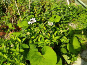 左: このプランターに葉去年の赤紫蘇3本が出ています。これはサツマイモっプランターになりましたが、共存します。
