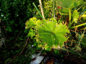 ペットボトルの上部を切って逆さにして中に入れ、回りをテープで留めただけのものです。中には水が入っています。ウリハ虫に近づき、南瓜の葉に5-6匹たかっているウリハを確認。下から手を近づけ、葉をそっと素早く丸めます。ボトルを葉の先端に近づけ漏斗にウリハムシを受けます。但し、相手も必死ですからボトル内でよじ登ろうとしますので、落としたら水を回して攪拌します。