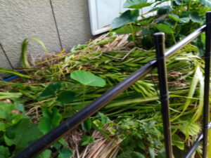 右: 今朝も1m位進みました。家屋に向かうj処に落ち葉がいっぱいでしたので、やはりこれはおかしいから取り除きました。我が家のジャガイモに使わせて貰います。取り敢えず、セイタカアワダチソウも運んで来ました。これも大事なガサガサ勇気になります。暫く夏蜜柑下で乾かします。