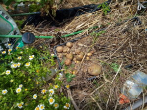 種イモを入れて敷き草だけで育てました。無施肥のジャガイモ。