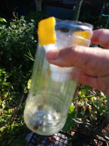 ペットボトルの上部を切って逆さにして中に入れ、回りをテープで留めただけのものです。中には水が入っています。ウリハ虫に近づき、南瓜の葉に5-6匹たかっているウリハを確認。下から手を近づけ、葉をそっと素早く丸めます。ボトルを葉の先端に近づけ漏斗にウリハムシを受けます。但し、相手も必死ですからボトル内でよじ登ろうとしますので、落としたら水を回して攪拌します。