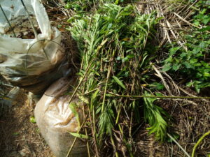 左&中: 一回目に運んできた落ち葉とセイタカアワダチソウ。