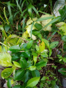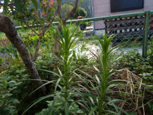 零れ種の自生種鉄砲ユリ。零れ種の実梅と園芸種鉄砲ユリ。右は金柑を頂いて、ペッ、と零した金柑苗!?毎年強いですね。