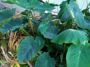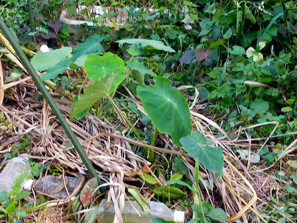 零れ種の里芋が三株、元気に生長しています。いつから此処に居たの?