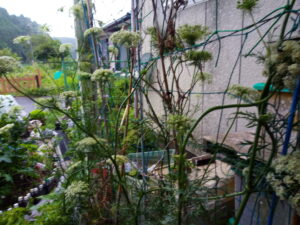 中: 人参、これはタキイさんの向陽2号だったかな。種が少しずつ熟して来ました。