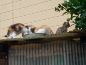 14時前、ちゃーちゃんが来たので、小雨だし、仔猫の餌付けをしなくては、と大皿で持って行ったら、3匹で押しまくって屋根から落としました。ちゃーちゃんのご飯も仔猫のご飯も入っていたのに~~~!もう一度作り直すと、キジちゃん以外、つまり三毛ちゃんと赤トラ君は確り食べました。この二匹サバイバル確定。キジちゃん、怪しいぞ!