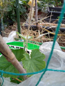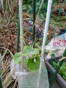 品種の分からないミニトマトを寝かせ植えして、頭を擡げて来ました。さぁ、脇芽が生長して垂直に伸びて呉れたら面白いんだけどな。その場合、何本出るでしょうか。2本?3本、それとも0本?