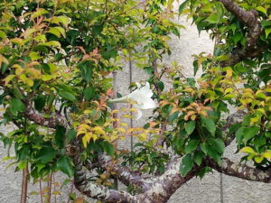 豊後梅さんが2-3日前に葉がクルリと丸まっていたので、麻紐で結んで垂直仕立てにしたところ、上の3本の枝はクルリがなくなり正常になりました。