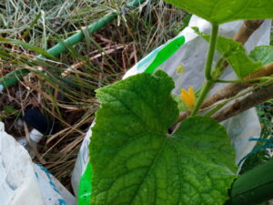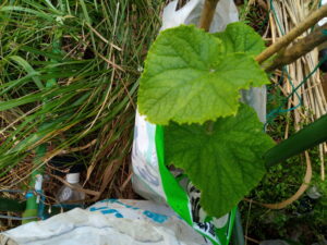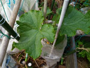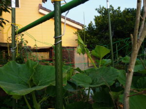 中: 一畝の南瓜の新芽がネットの一番上に到達しました。30㎝の空白を乗り切れるかなぁ。麻紐で誘引しておこう。