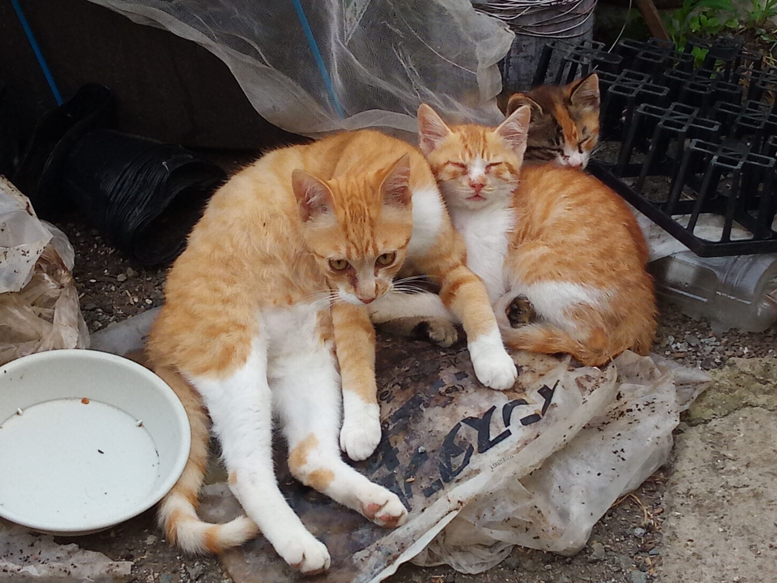 4月6日生まれの野良ちゃんですが、三匹兄妹です。雄は赤トラ君のみ。ちび三毛ちゃんとキジちゃんは女の仔です。赤トラ君とちび三毛ちゃんは生後2か月になったところで私がお節介精神を発揮して離乳に6月16日に踏み切りました。昨日で離乳食10日目です。但し、キジちゃんはおっぱい拘りっこなので、4日目です。写真はナガ兄ちゃんと仔猫達。
