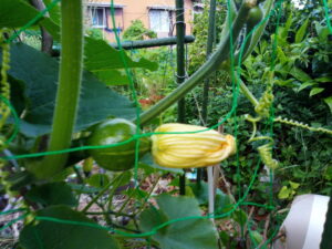 左: 人工授粉したのか、その前に既に受粉していたのか、南瓜が膨らんで来ました。素晴らしい命!嬉しいなぁ。収穫するのも嬉しいけれど、生長過程を見られるのは何ともワクワクして素敵です。