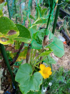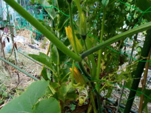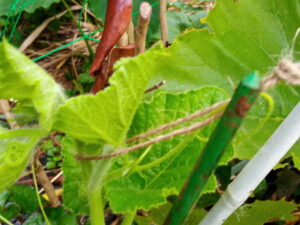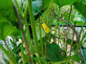 昨夕、南瓜の各蔓を天井ネットに誘引するように麻紐で結びました。
