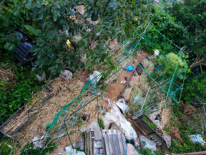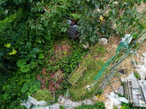 朝ごはん前に本日の草運びは終了です。籾殻袋2/3位かしらね。二畝北の東側で終わりました。汗びっしょり。後二回位かな。でも、それで終わりではありません。西条柿の根本はまたまた凹んで来ています。笑 無限ループです。昨日運んだ草は既に白っぽくなっています。