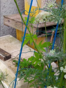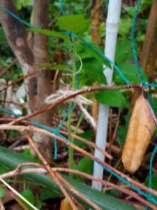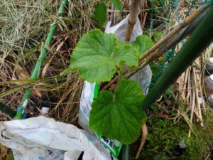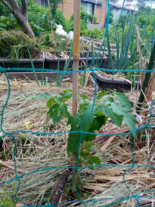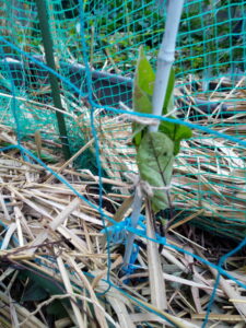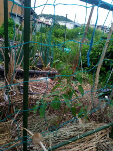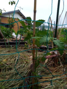 本葉で立ての稚苗が強いというのは本で読んだりしても、姿を見ると本当に大丈夫か?、と言う氣持ちになりますよね。支柱を立てて置いて、植穴に水を入れてから苗を植えて、支柱に引き寄せる。緑色のカメムシはダメだけど、それ以外のカメムシやテントウムシ騙しは肥料分を吸って呉れるからそのまま。