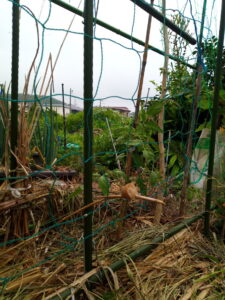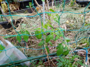 中: トマトの縛り前。二畝の大玉トマトですが、先日麻紐で軽く縛りましたが、既に伸びて来ました。また縛って置かなくては!縛ってからのホルモンの働きが凄いです。