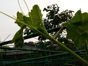 左: 脇の通路にあるIさんから頂いた苦瓜です。頑張りました。凄い!