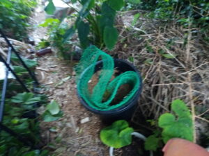 夏蜜柑下の25L鉢には既に籾殻に混じった土が入っているので、茶殻、コーヒー滓、米ぬかを入れる事にしました。青い金網はナガ君除けです。彼はトイレに使うので、邪魔なものを入れて置かないとダメなんですよ。此処で好氣発酵させます。雨の日はビニールを掛けます。