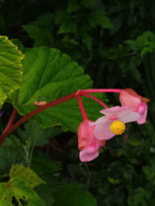 左: 白躑躅下の秋海棠に花が着きました。