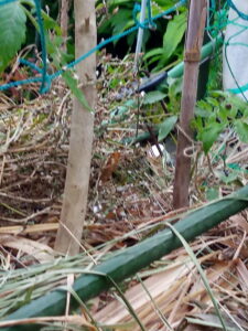 トマトの縛り紐を持って表に出たら、ちび三毛ちゃんが食べて居ました。家に入る時にはキジちゃんが遊んでいました。無事ね。OKです。