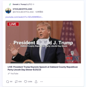 Truth Social で見た動画はYouTube 二元ネタがありました。3.5時間の超長尺です。Lincoln Day のパーティ。