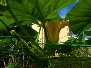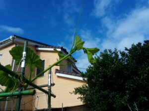 左: 南瓜が天井ネットから脱出です。『延長ネットは何処だっ!?』