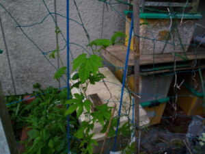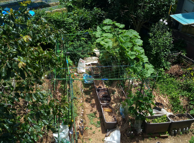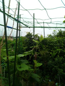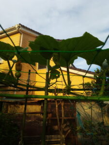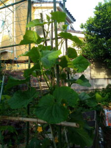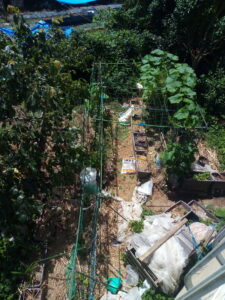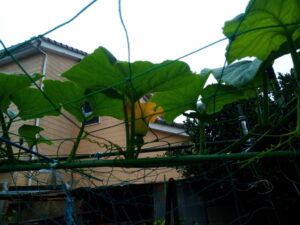 二畝の南瓜が天井ネットに届きました。夕方には4本の子蔓だか孫蔓高が動き回っていました。やっぱりネット拡張が早急に必要かなぁ!?