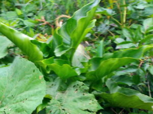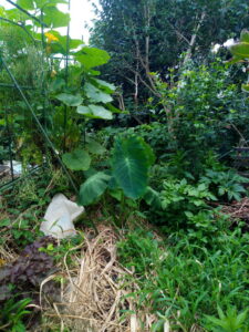 右: 零れ種の里芋も一人前になりました。大きな葉っぱで、なかなかやるじゃん!