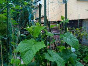 右: 零れ種で出た南瓜?禅寺丸の根本に突如現れました。すごくいい苗です。物干しでも植えているけれど、まだ動きはない?ダメかなぁ。