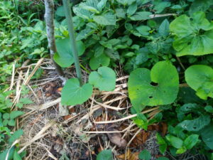 中: シルクスイートが葉を茂らせて来ました。そろそろ支柱を用意するかな。