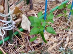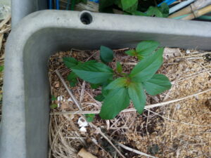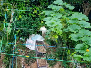 右: 零れ種で出た南瓜?禅寺丸の根本に突如現れました。すごくいい苗です。物干しでも植えているけれど、まだ動きはない?ダメかなぁ。