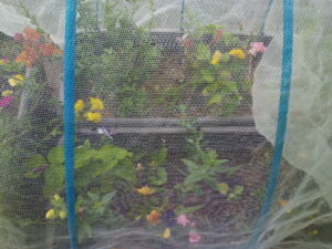 左&中: 玄関アプローチのプランターですが、今回初めての試みで植えっ放しです。今の時期でも色々と咲いています。園芸家だったらサッサと抜いて次の季節の花を植えるのでしょうね。それも省略しました。綺麗に見える花だけを愛して、綺麗じゃなくなったら捨てる?最後まで命を全うさせてみよう。其の種にはどの位の力があるのだろうか。次世代に命のバトンが出来るのであろうか。植えてある花の中でサフィニアパープルとビオラブラックは既に二年目を迎えています。キンギョソウも今年初めてでしたが、切り花として大活躍して呉れました。来年、どのような姿でお目にかかれるのでしょうか。楽しみです。更に播種で育てたサルビア混合をこの中に3-4株定植しました。
