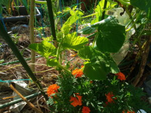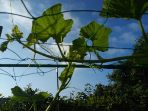 写真がWPの都合で入りません。草刈りをしてプランターや畝に置きました。14時50分、ようやく入れました。南瓜と胡瓜の葉がそよそよとやや強めの風に揺れている姿は何時間見ていても見飽きません。南瓜の葉蔓が胡瓜に適度な木陰を提供しています。