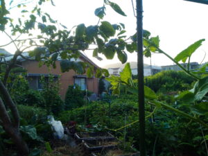 お昼前、南瓜の葉が地面に黒く影を落としています。もう少し生長したら、午後の猫達の格好の溜まり場になりそうです。人参畝の方にも影が欲しいなぁ。二畝の南瓜さんの生長を待ちましょう。