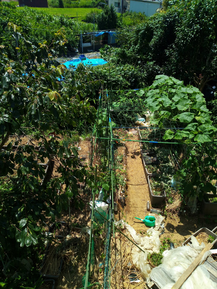 お昼前、南瓜の葉が地面に黒く影を落としています。もう少し生長したら、午後の猫達の格好の溜まり場になりそうです。人参畝の方にも影が欲しいなぁ。二畝の南瓜さんの生長を待ちましょう。