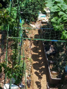 右: 棚上の南瓜の存在感が出て来ました。今日届く支柱6本で猫小屋の上を覆います。