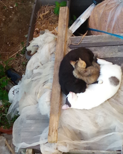 窓から顔を出したら潮の匂いがしました。東の山の方が何となく靄っぽいからかな。何気無く下を見たら、キーちゃんがクロスケとはっちゃんに子守されていました。不織布やネットが放り投げられているのは私が不精だからです。猫達って共同子育てするのよね。笑 クロスケも兄弟で育ったし、はっちゃんも其処に参加して育ったし、皆で育つのが良いな。形からしてキーちゃんが最後に乗って来たのかな。