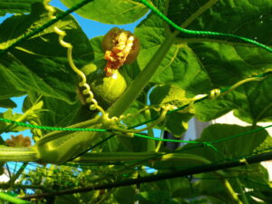 左: どことなく元気が無い南瓜の果実。これは育ちません。蔓の根本寄りです。