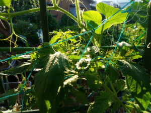 中: インゲン?の蔓が芍薬やら色々なものに絡んでいました。解いてネットを張ってみます。