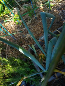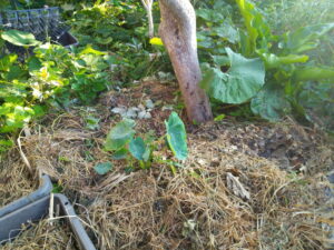 左: 元の堆肥枠を土をすぐ横の通路(トウモロコシ予定地)に落とします。分解しない剪定枝等をいじってみましょう。どうなるかな。